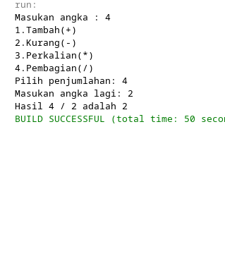 System.out.print("1.Tambah(+)\n2.Kurang(-)\n3.Perkalian(*)\n4.Pembagian(/)\nPilih penjumlahan: ");