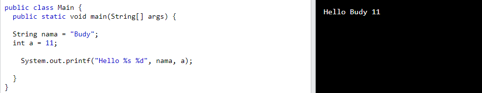 Print ini bisa menggunakan kode khusus seperti menggunakan kode %d (integer) atau %s (string)